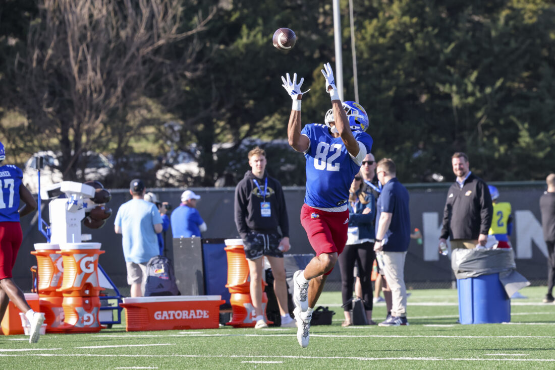 Kansas receiver Jackson Cook participates in Kansas football’s spring practice on Thursday, March 26, 2026, in Lawrence.
