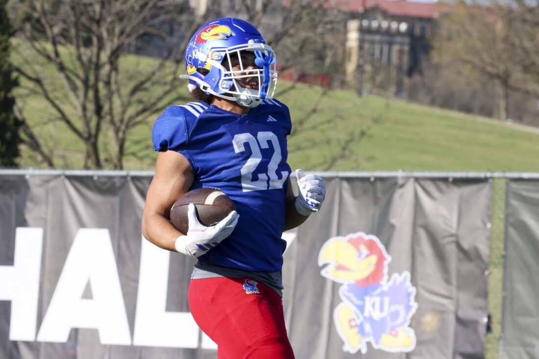 Kansas running back John Kelly participates in Kansas football’s spring practice on Thursday, March 26, 2026, in Lawrence.