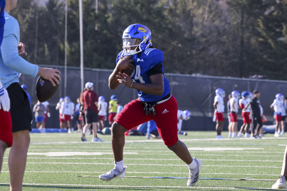 Kansas running back Dylan Edwards participates in Kansas football’s spring practice on Thursday, March 26, 2026, in Lawrence.