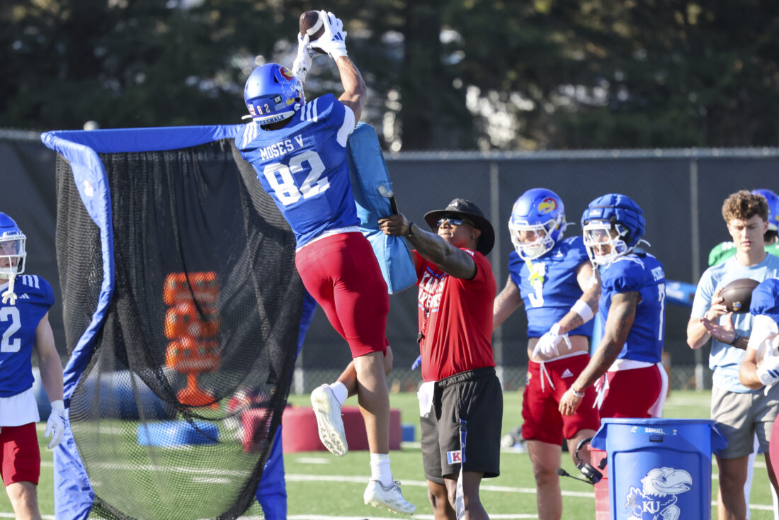Kansas receiver Isreal Moses participates in Kansas football’s spring practice on Thursday, March 26, 2026, in Lawrence.