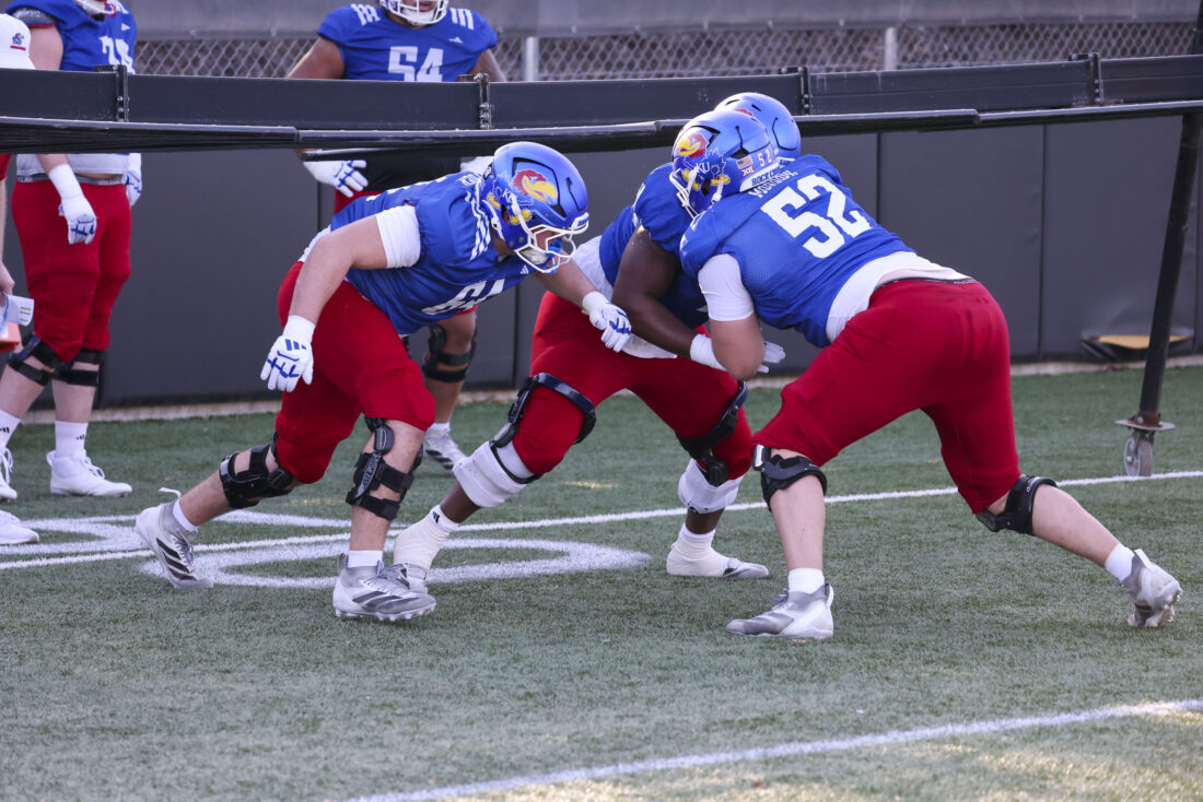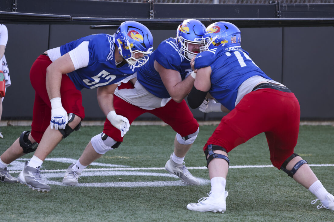 Kansas offensive linemen Kaden Snyder, DeAndre Harper, and Nick Morrow (left to right) participate in Kansas football’s spring practice on Thursday, March 26, 2026, in Lawrence.