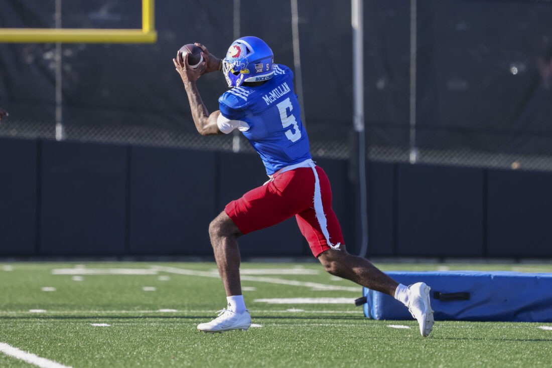 Kansas receiver Nik McMillan participates in Kansas football’s spring practice on Thursday, March 26, 2026, in Lawrence.