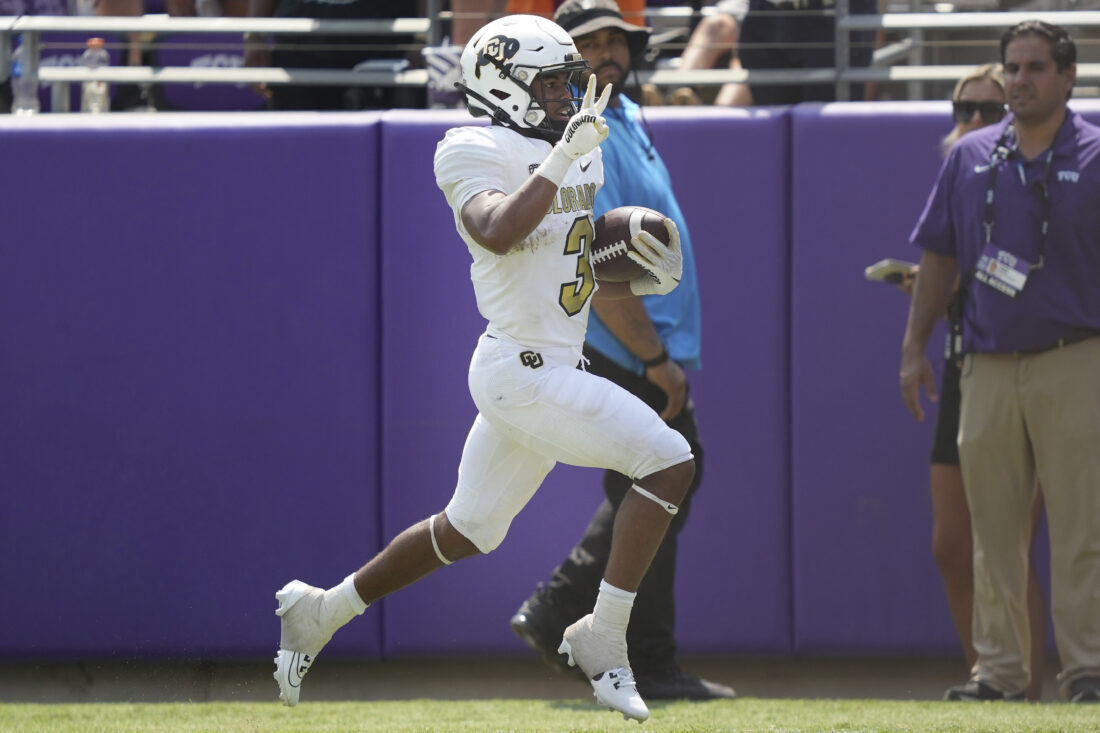 Colorado running back Dylan Edwards gestures on his way to score a touchdown during the second half of an NCAA college football game against TCU Saturday, Sept. 2, 2023, in Fort Worth, Texas.