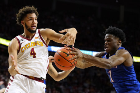 Kansas guard Joseph Yesufu (1) grabs a rebound in front of Iowa State forward George Conditt IV (4) during the second half of an NCAA college basketball game, Tuesday, Feb. 1, 2022, in Ames, Iowa. Kansas won 70-61. (AP Photo/Charlie Neibergall)
