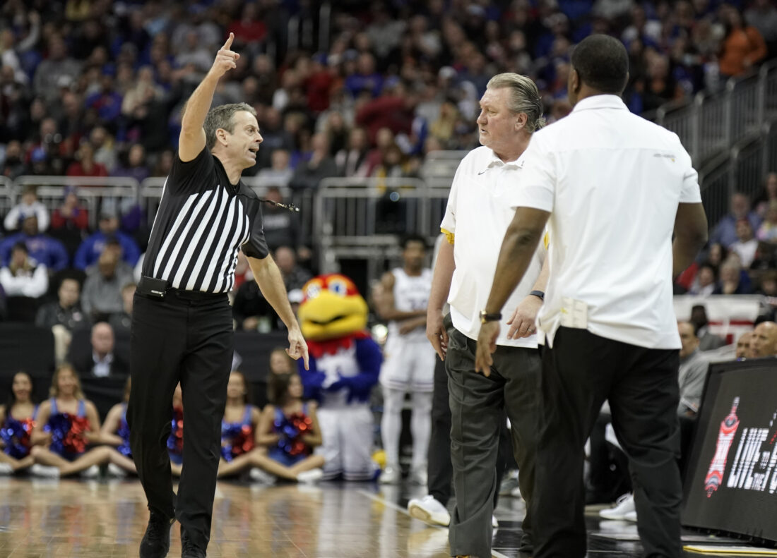 West Virginia head coach Bob Huggins is ejected from the game during the first half on Thursday, March 10, 2022 at T-Mobile Center in Kansas City.