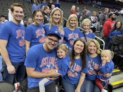Margaret Self, back right, the mother of Kansas basketball coach Bill Self, poses for a group photo with her family during a recent Kansas postseason game. After the passing of Self’s father in late January, Margaret has been able to become a fixture behind the KU bench again, and she’ll be in New Orleans this weekend when the Jayhawks play in the 2022 Final Four.