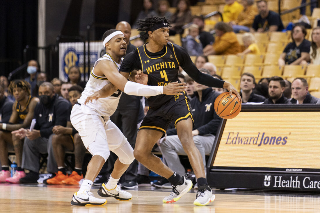 Wichita State’s Ricky Council IV, right, collides with Missouri’s Jarron Coleman, left, during the second half of an NCAA college basketball game Friday, Nov. 26, 2021, in Columbia, Mo. (AP Photo/L.G. Patterson)