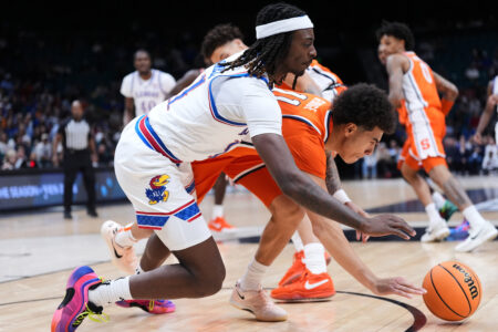 Kansas guard Jamari McDowell, left, and Syracuse guard Naithan George, right, chase a loose ball during the first half of an NCAA college basketball game in the Players Era tournament in Las Vegas, Tuesday, Nov. 25, 2025.