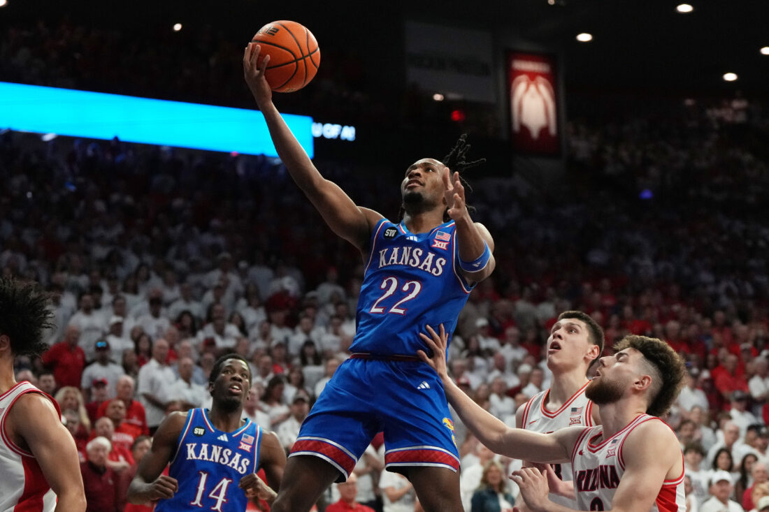 Kansas guard Melvin Council Jr. attacks the basket during the game against Arizona on Saturday, Feb. 28, 2026, in Tucson, Ariz.