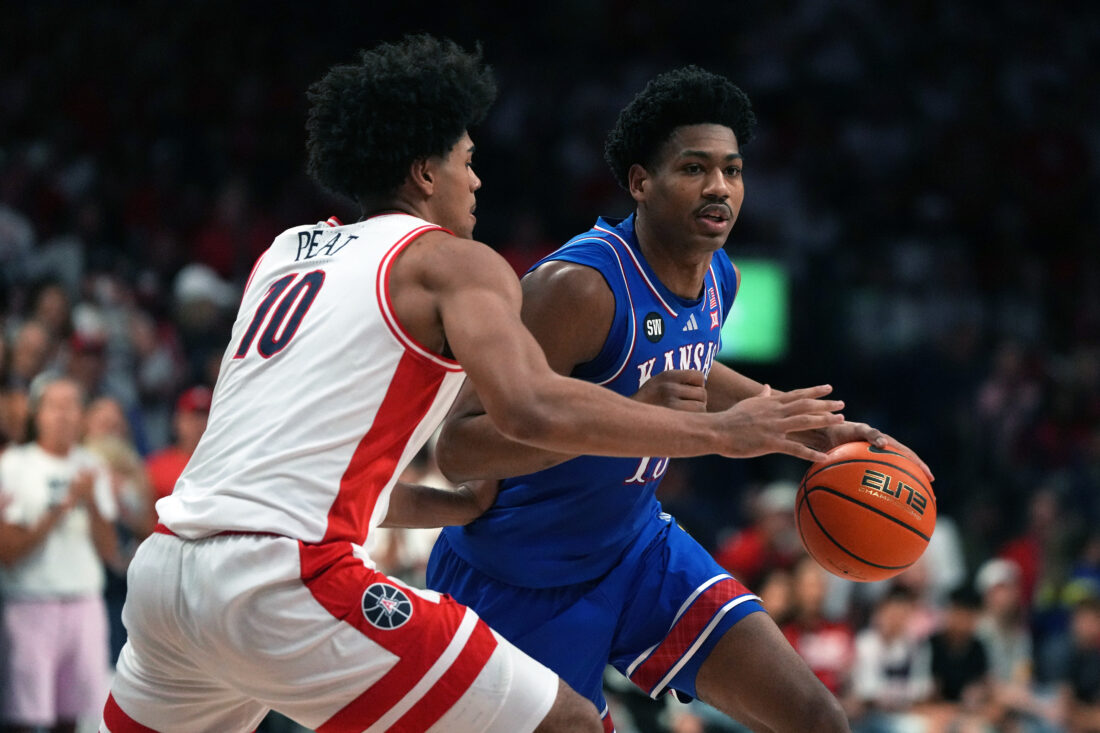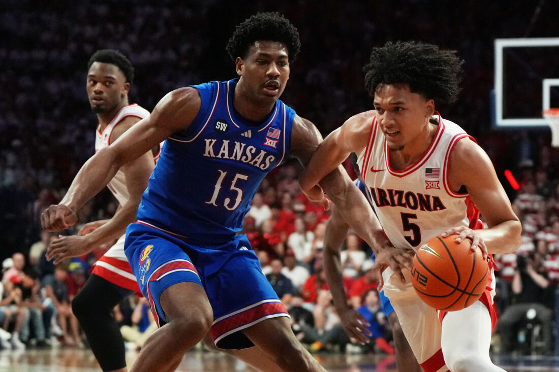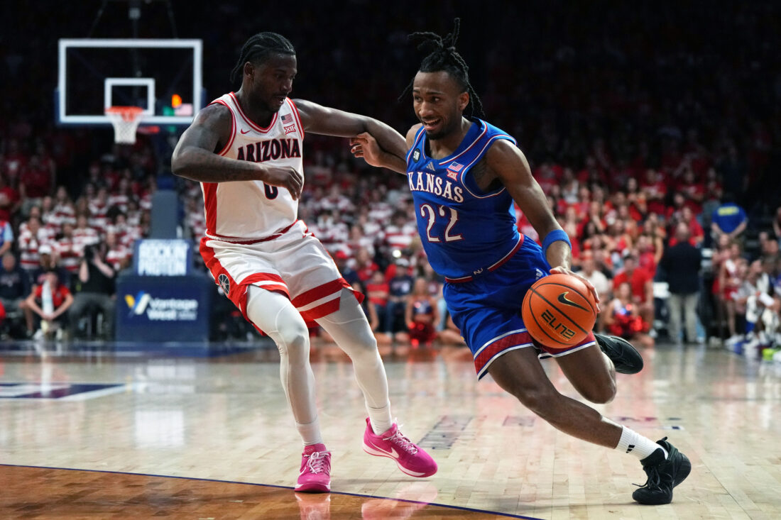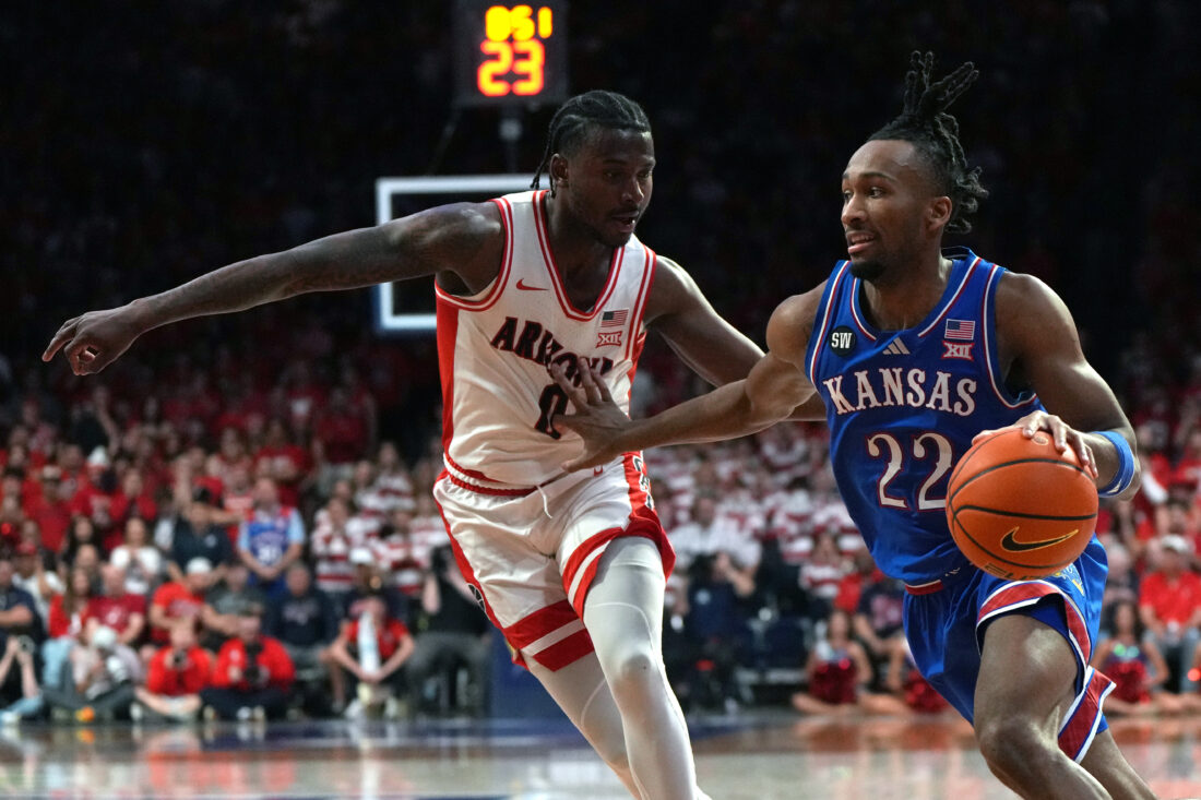 Kansas guard Darryn Peterson (22) drives against Arizona guard Jaden Bradley during the first half of an NCAA college basketball game Saturday, Feb. 28, 2026, in Tucson, Ariz.