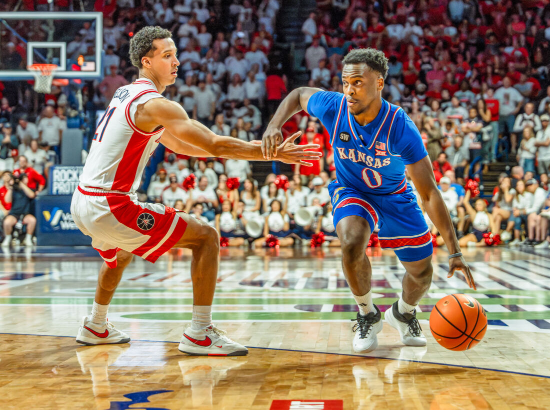 Kansas guard Nginyu Ngala drives towards the baseline during the game against Arizona on Saturday, Feb. 28, 2026, in Tucson, Ariz.