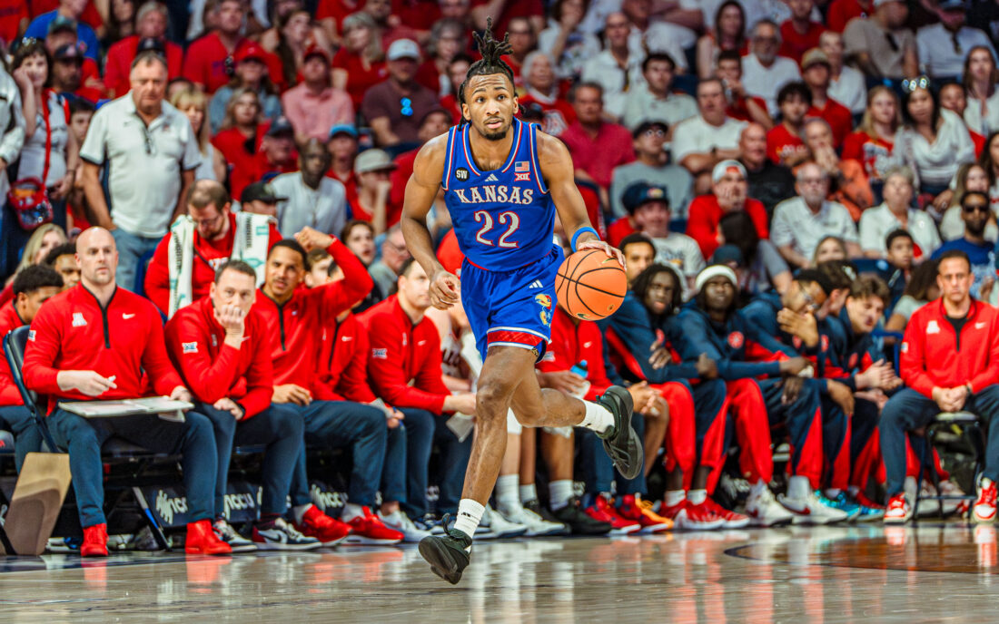 Kansas guard Darryn Peterson brings the ball up the court during the game against Arizona on Saturday, Feb. 28, 2026, in Tucson, Ariz.