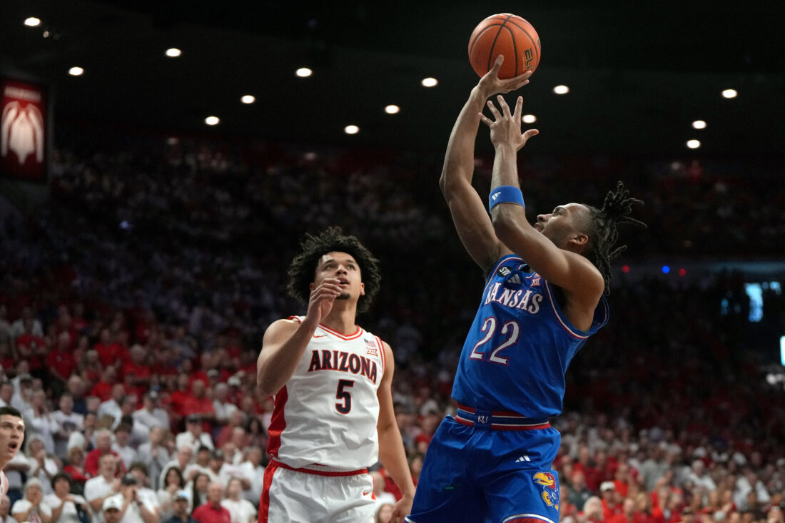 Kansas guard Elmarko Jackson takes a midrange jump shot during the game against Arizona on Saturday, Feb. 28, 2026, in Tucson, Ariz.