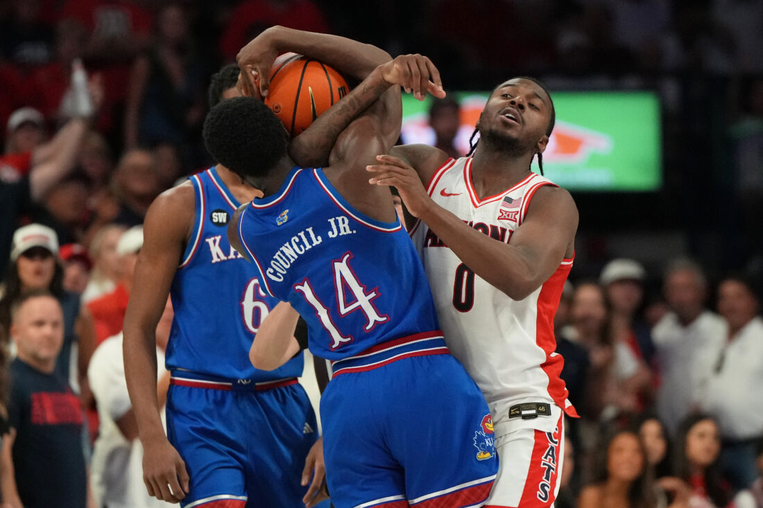 Kansas guard Melvin Council Jr. and forward Flory Bidunga contest a shot by Jaden Bradley during the game against Arizona on Saturday, Feb. 28, 2026, in Tucson, Ariz.