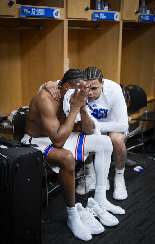 Kansas guard Jayden Dawson, right, comes in to comfort teammate Elmarko Jackson following the Jayhawks’ loss to St. John’s on Sunday, March 22, 2026 at Viejas Arena in San Diego. Photo by Nick Krug