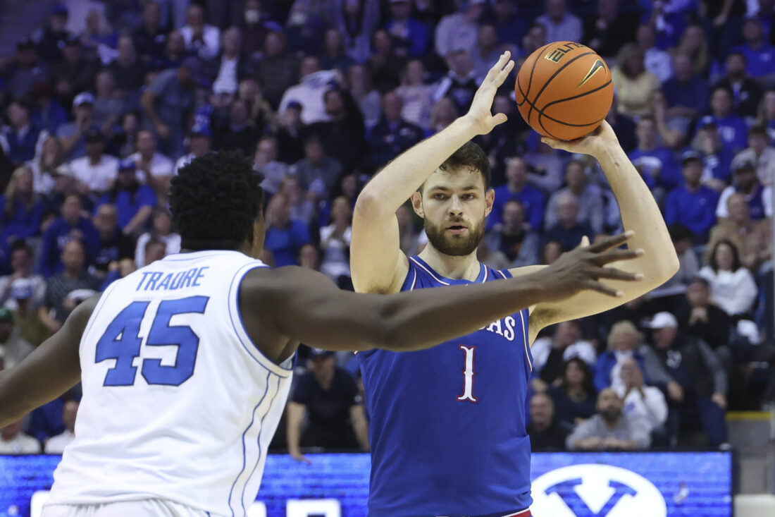 Kansas center Hunter Dickinson (1) holds the ball away from BYU center Fousseyni Traore (45) during the second half of an NCAA college basketball game, Tuesday, Feb. 18, 2025, in Provo, Utah.