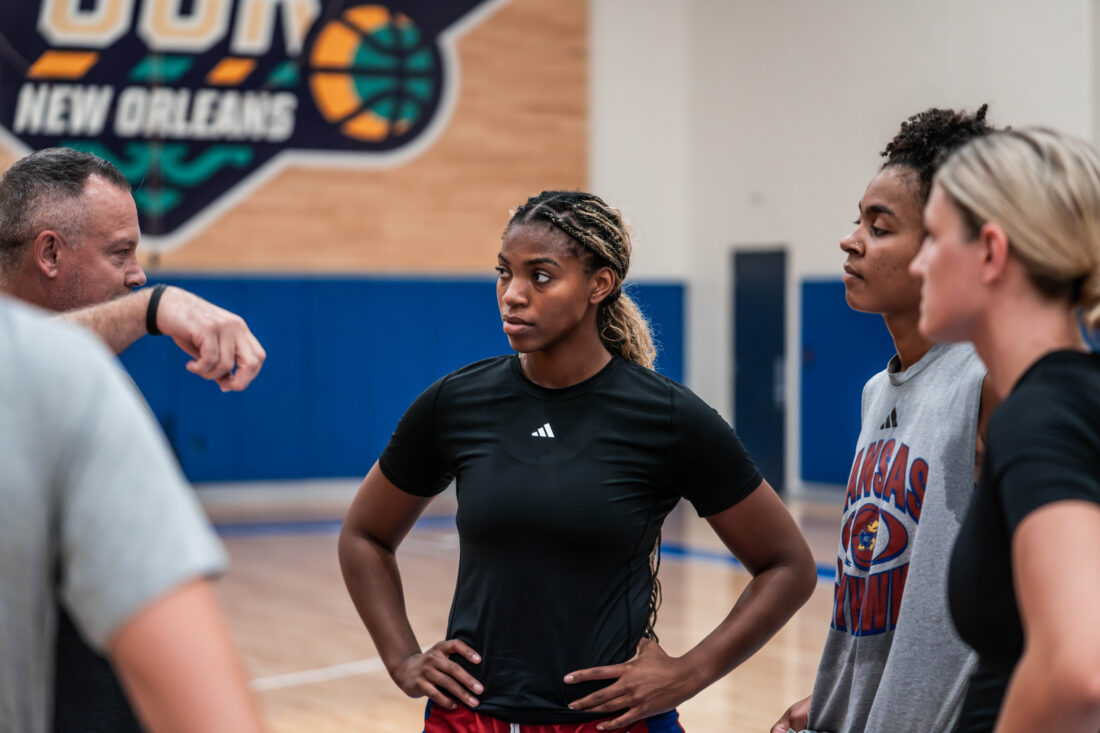 Kansas guard S’Mya Nichols, center, listens to head coach Brandon Schneider during summer workouts in July.