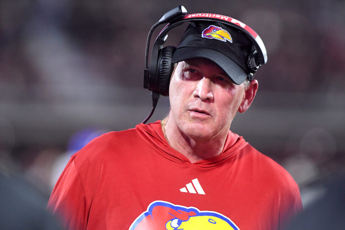 Kansas head coach Lance Leipold walks along the sidelines during the second quarter of an NCAA college football game against Texas Tech Saturday, Oct. 11, 2025, in Lubbock, Texas.