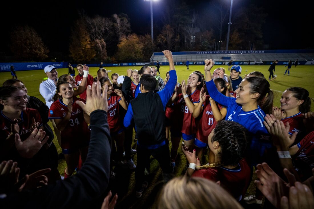 The Kansas soccer team celebrates its 3-1 victory over Louisville on Thursday, Nov. 20, 2025, in Durham, N.C.