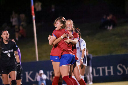 The Lancers got a burst of momentum from a free-kick goal scored against the run of play. Jestrovic’s attempt from just past the midfield line took a threatening bounce into the box. Sophie Dawe couldn’t grab it and KU’s defense couldn’t prevent it from rolling all the way into the goal to make it 2-1.