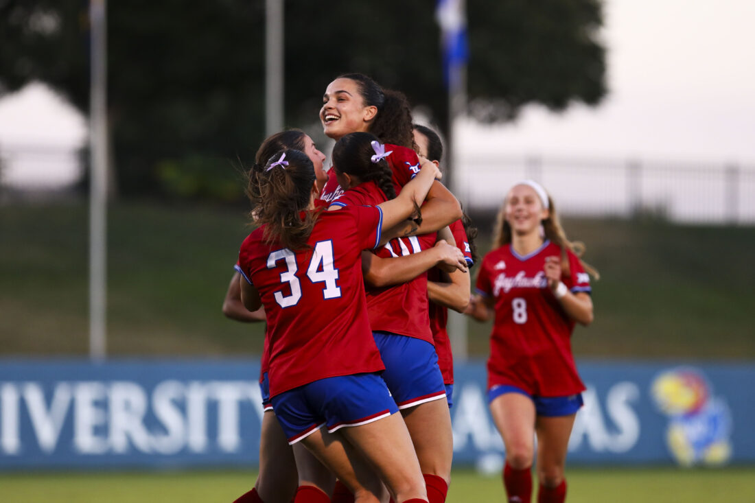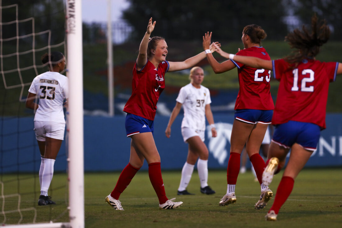 Kansas took a 2-1 lead about eight minutes later, when Lydia Viets made a cross that found the feet of Becca Smith, who scored her third goal of the season to give the Jayhawks the advantage. However, that lead was short-lived, as the Mountaineers’ Alexis Re got a pass in the offensive zone, turned, and put a shot in the top right corner of the net from long range to tie the match, 2-2, at 39:19.