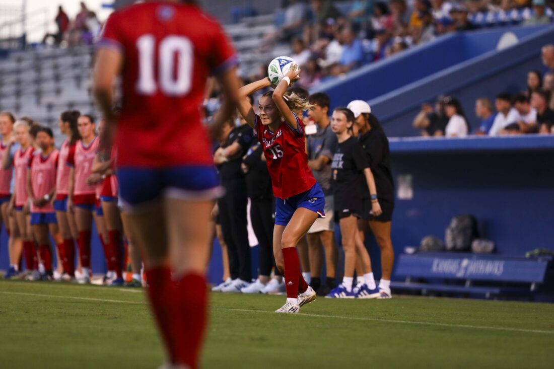 Kansas defender Caroline Castans throws the ball in against West Virginia on Thursday, Oct. 16, 2025 at Rock Chalk Park.