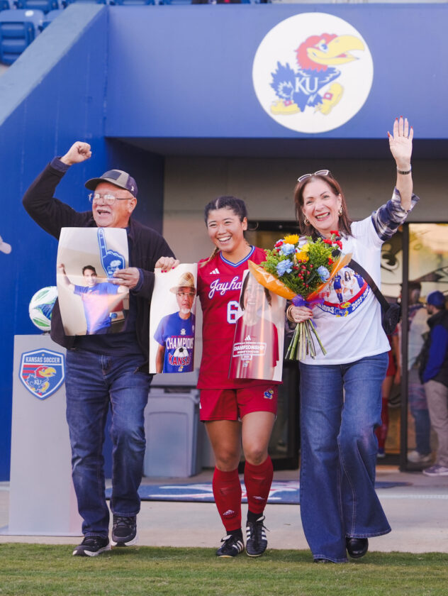 Kansas midfielder Emika Kawagishi walks out of the tunnel for senior night recognition with her parents before the game against Colorado on Thursday, Oct. 30, 2025, in Lawrence.