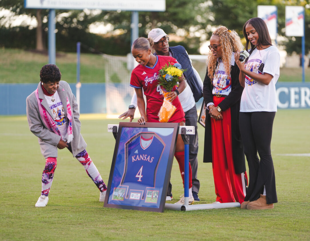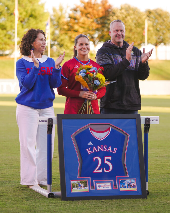 Kansas midfielder Mackenzie Hammontree stands for senior night recognition with her parents before the game against Colorado on Thursday, Oct. 30, 2025, in Lawrence.