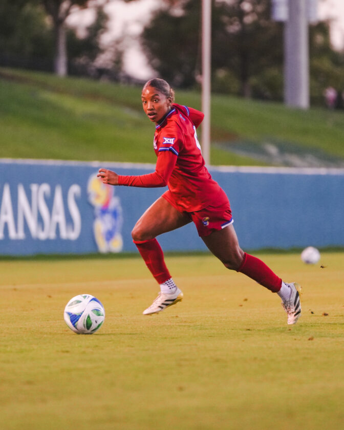 Kansas midfielder Livvy Moore runs up the sideline with the ball during the game against Colorado on Thursday, Oct. 30, 2025, in Lawrence.