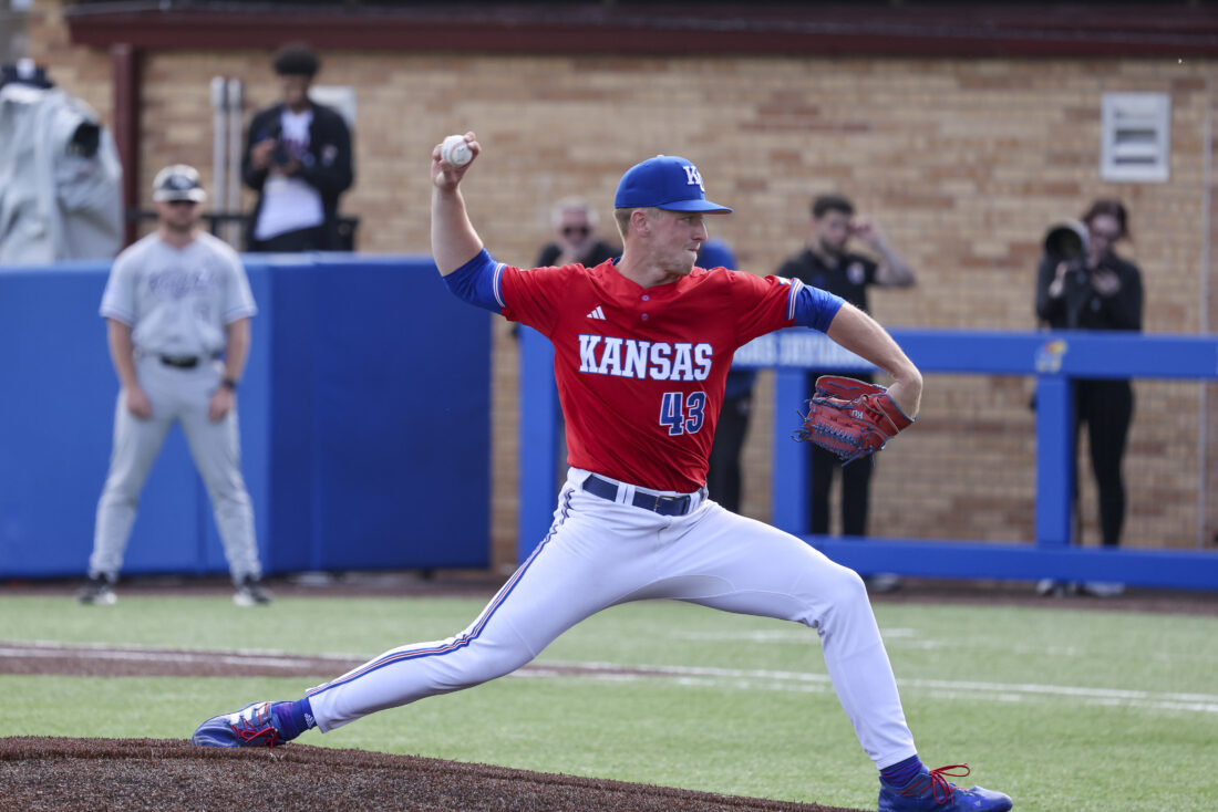 Kansas pitcher Boede Rahe delivers a pitch during game two of the Jayhawks’ doubleheader against UCF on Saturday, April 11, 2026, at Hoglund Ballpark in Lawrence.
