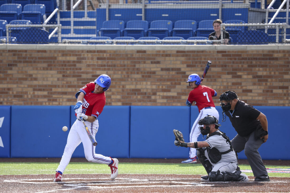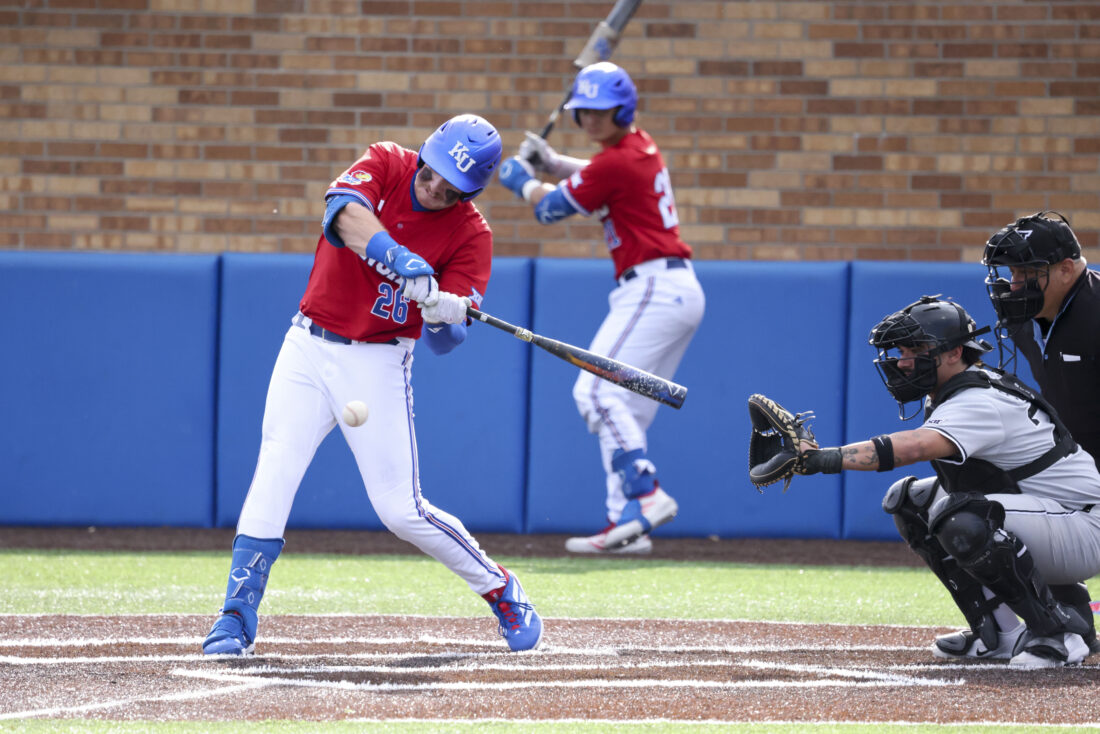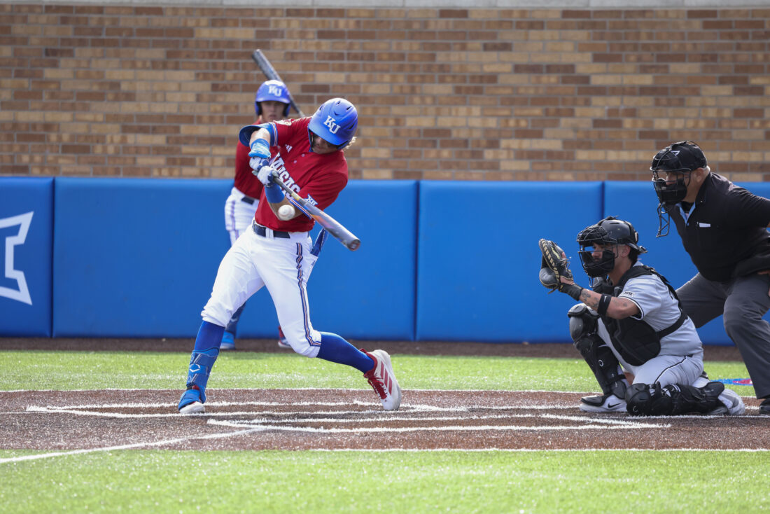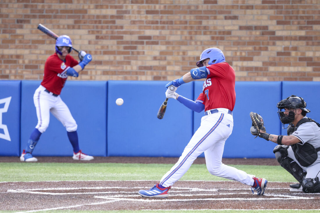 Kansas right fielder Jordan Bach makes contact during game two of the Jayhawks’ doubleheader against UCF on Saturday, April 11, 2026, at Hoglund Ballpark in Lawrence.