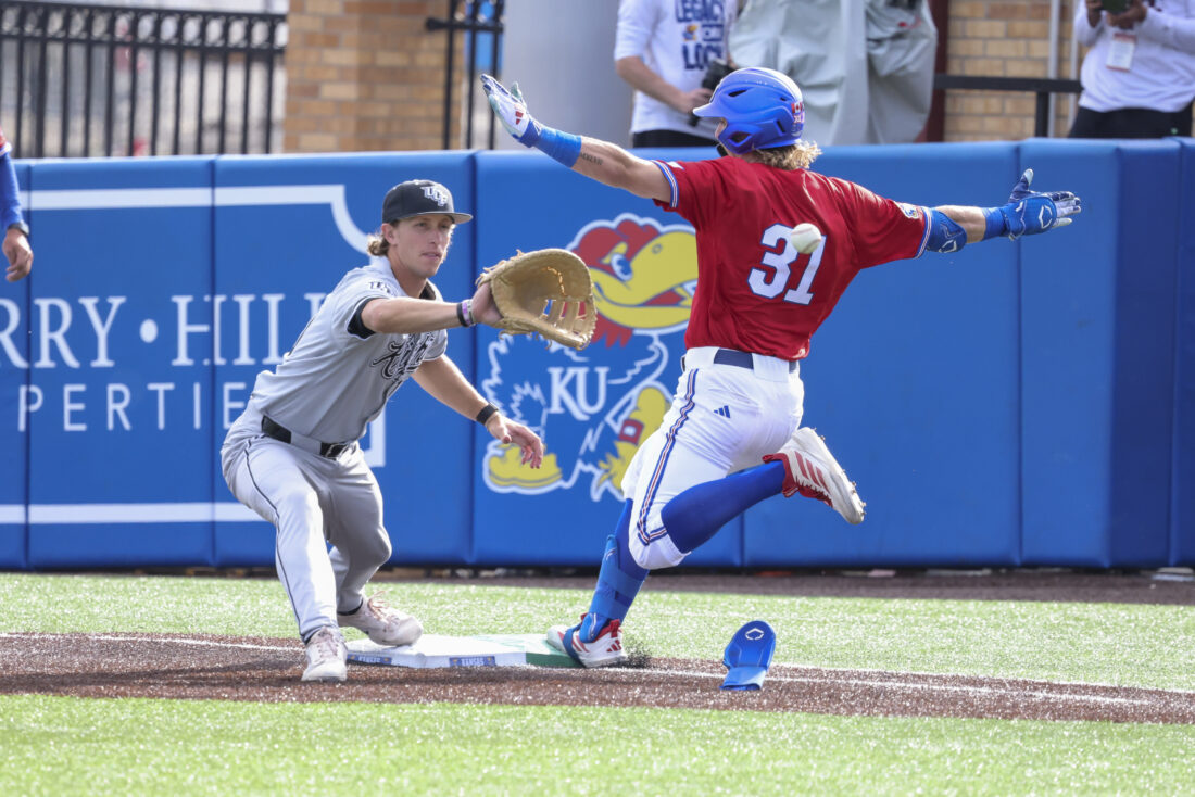 Kansas right fielder Jordan Bach beats out the throw at first during game two of the Jayhawks’ double header against UCF on Saturday, April 11, 2026, at Hoglund Ballpark in Lawrence.