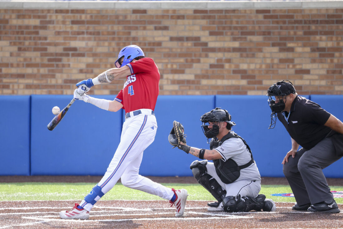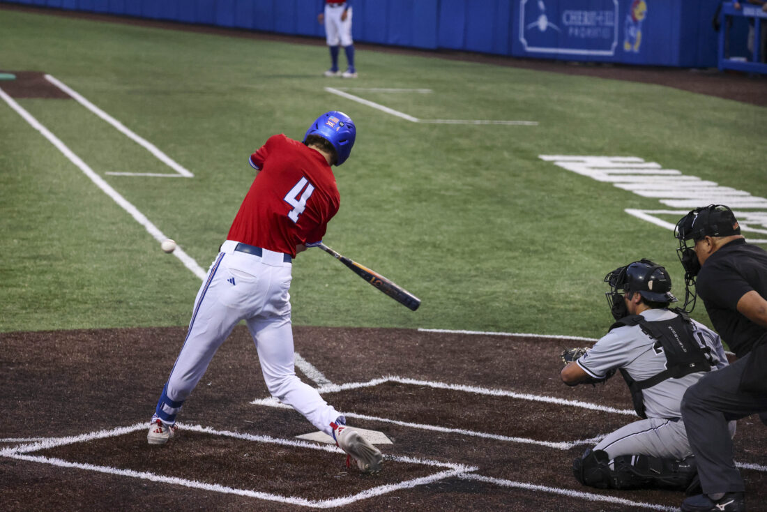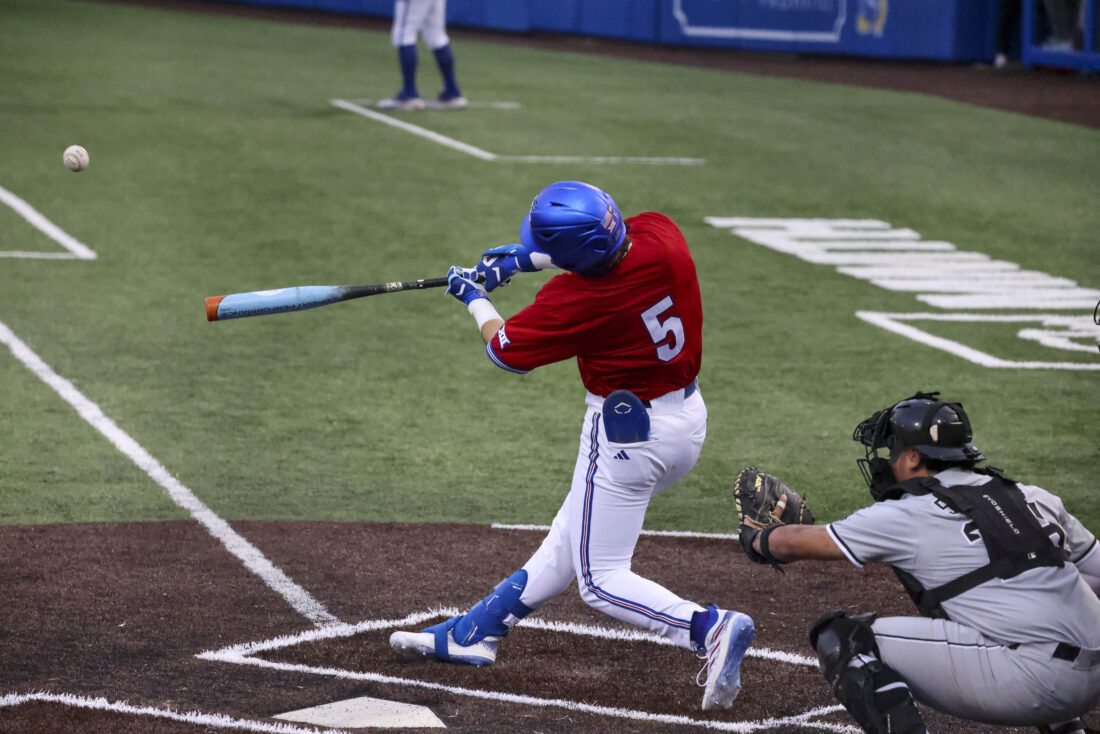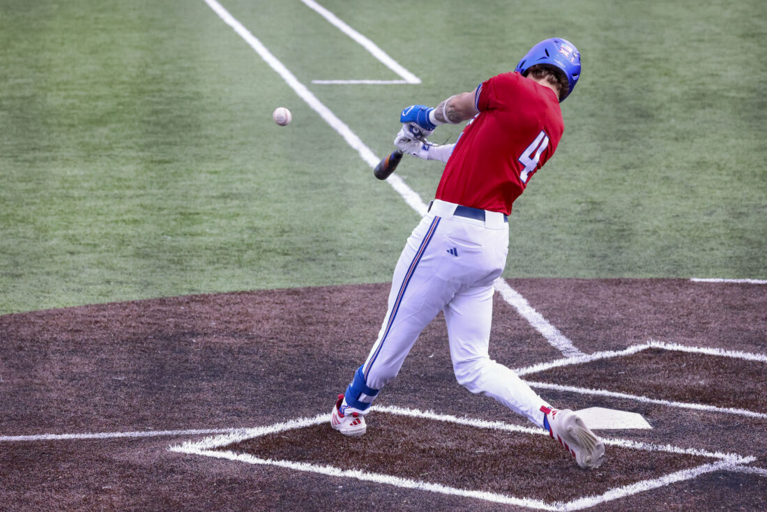 Kansas senior Max Soliz Jr. connects with a pitch during game two of the Jayhawks’ doubleheader against UCF on Saturday, April 11, 2026, at Hoglund Ballpark in Lawrence.