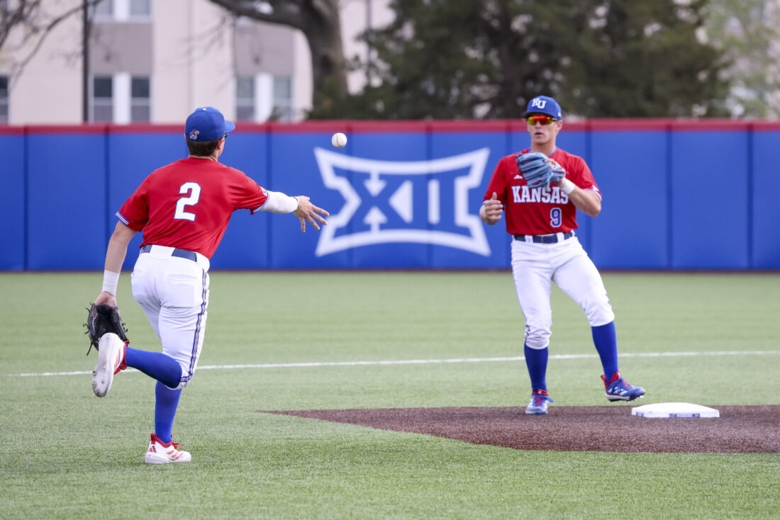 Kansas short stop Tyson LeBlanc (2) tosses the ball to second baseman Cade Baldridge for an out during game two of the Jayhawks’ doubleheader against UCF on Saturday, April 11, 2026, at Hoglund Ballpark in Lawrence.