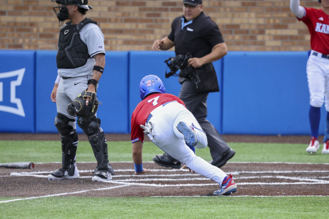 Kansas junior Dylan Schlotterback slides safely into home during game two of the Jayhawks’ doubleheader against UCF on Saturday, April 11, 2026, at Hoglund Ballpark in Lawrence.
