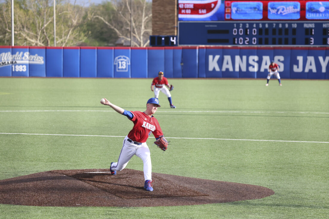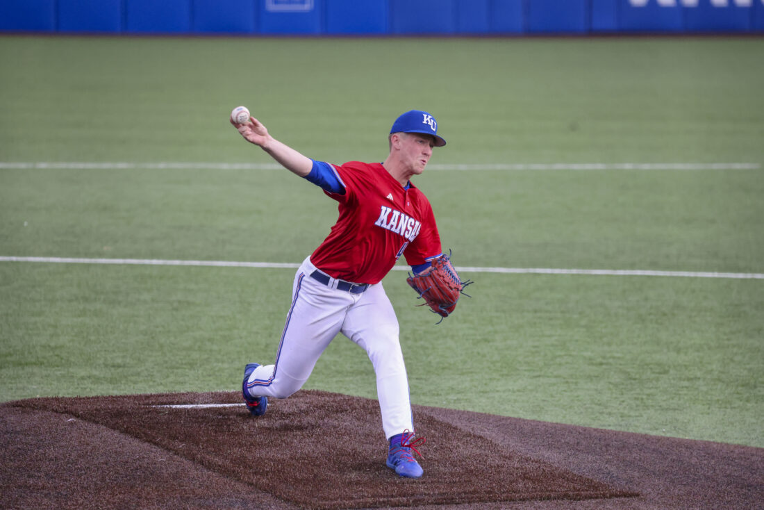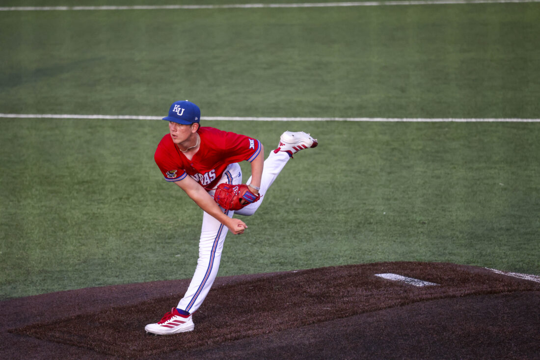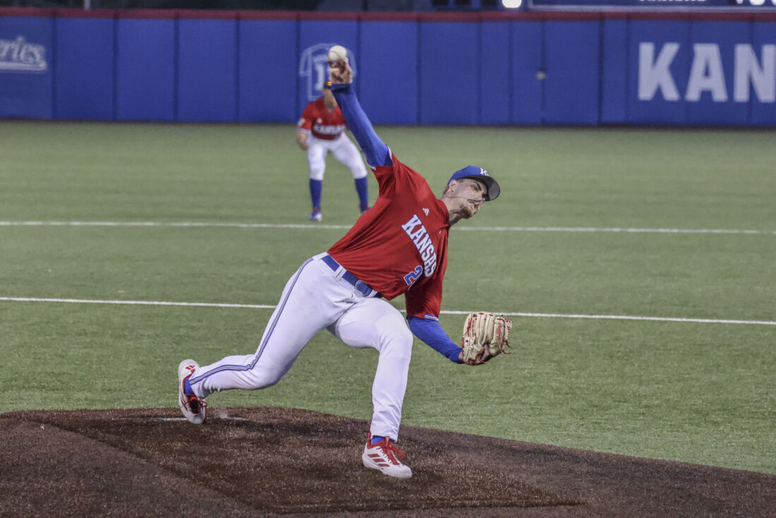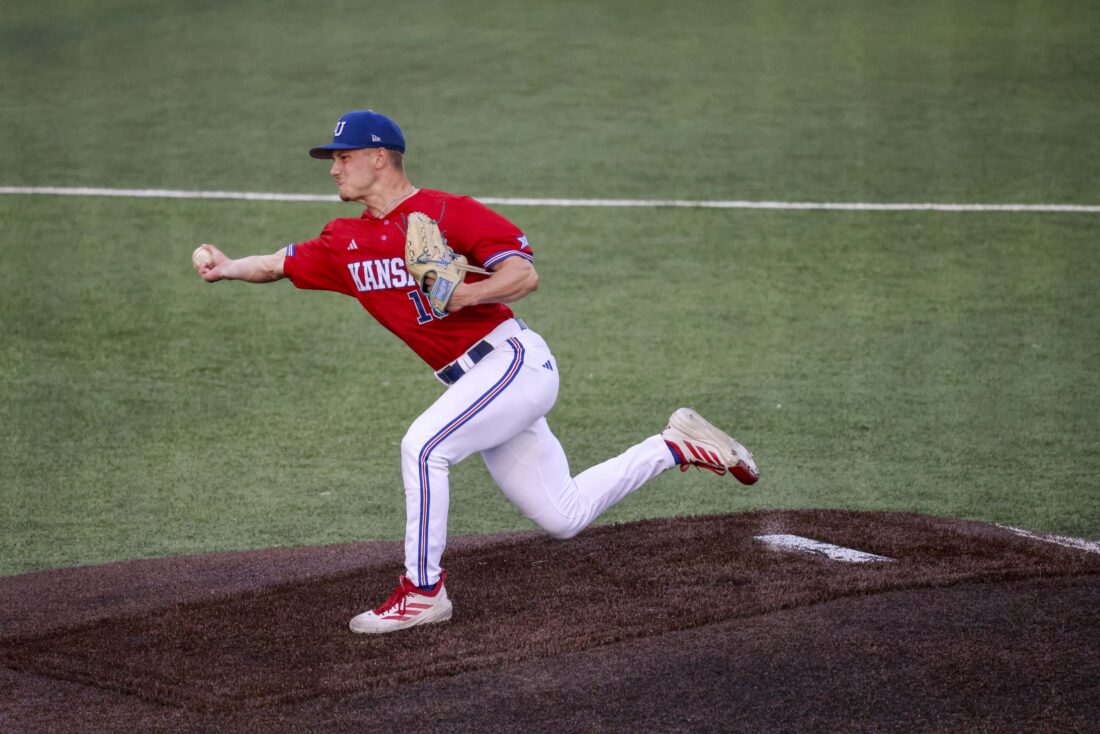 Kansas pitcher Mason Cook releases a pitch during game two of the Jayhawks’ doubleheader against UCF on Saturday, April 11, 2026, at Hoglund Ballpark in Lawrence.