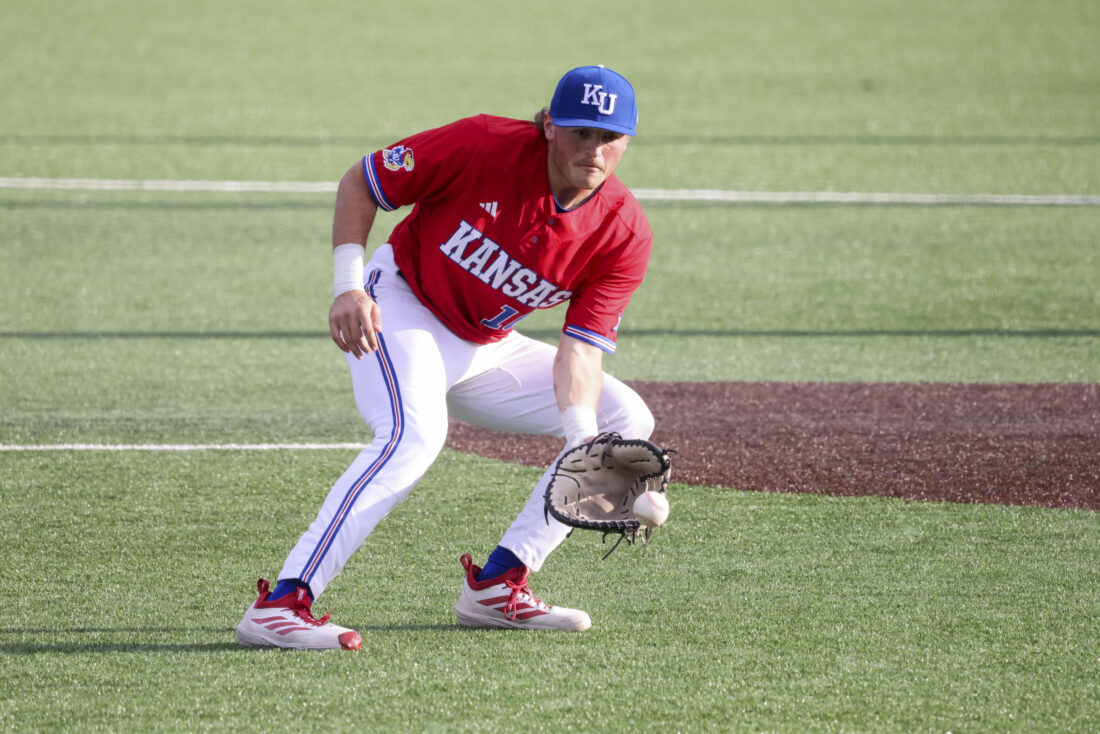 Kansas second baseman Cade Baldridge fields a chopper behind second base during game two of the Jayhawks’ doubleheader against UCF on Saturday, April 11, 2026, at Hoglund Ballpark in Lawrence.