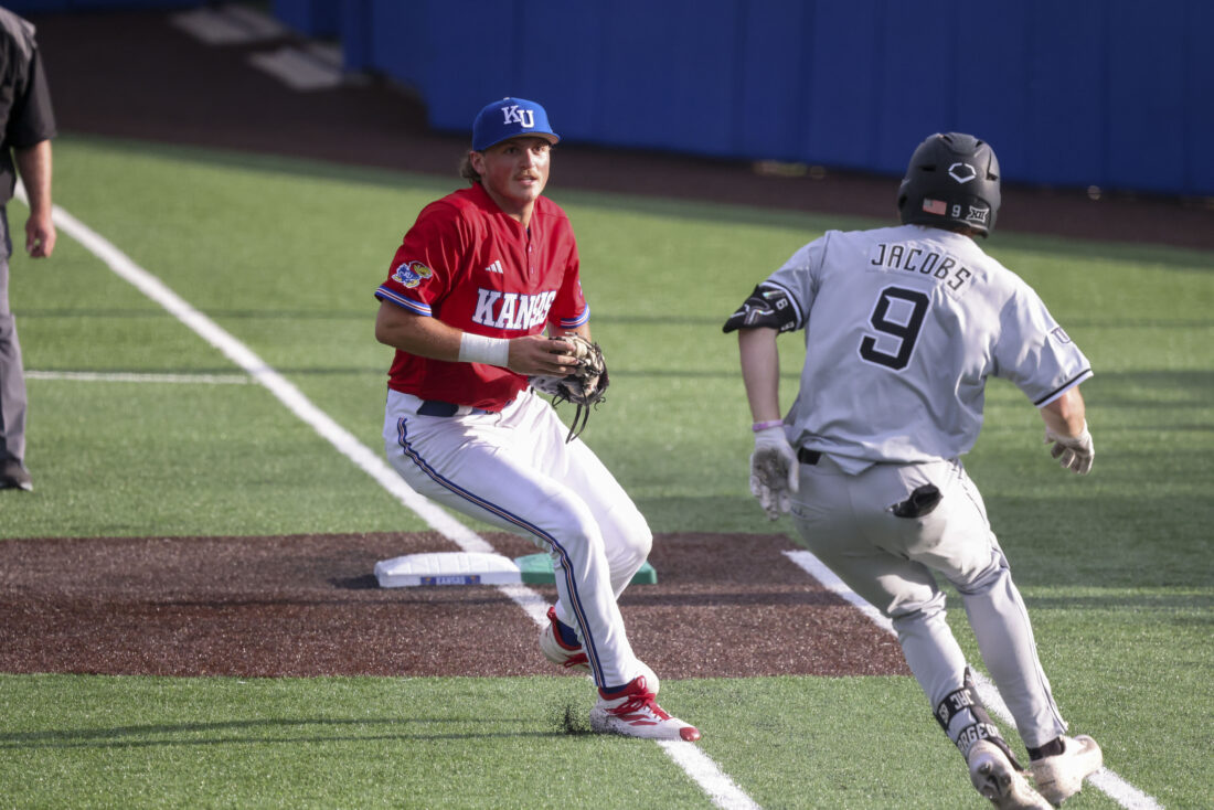 Kansas first baseman Jake Dykhoff goes to tag out UCF’s Austin Jacobs during game two of the Jayhawks’ doubleheader on Saturday, April 11, 2026, at Hoglund Ballpark in Lawrence.