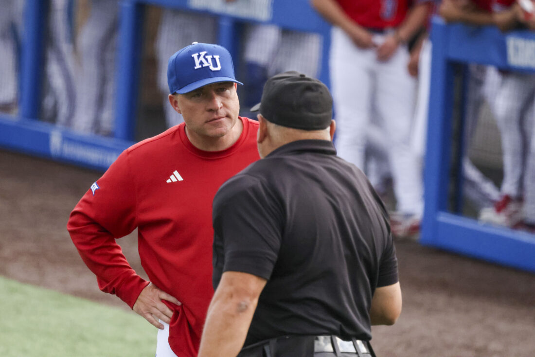 Kansas head coach Dan Fitzgerald speaks with the home plate umpire during game two of the Jayhawks’ doubleheader against UCF on Saturday, April 11, 2026, at Hoglund Ballpark in Lawrence.