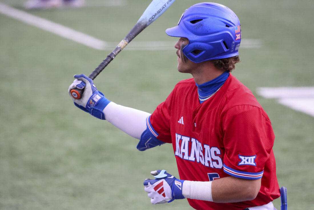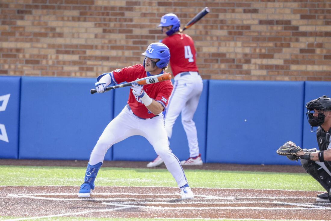 Kansas senior Josh Dykhoff looks to make contact during game two of the Jayhawks’ doubleheader against UCF on Saturday, April 11, 2026, at Hoglund Ballpark in Lawrence.