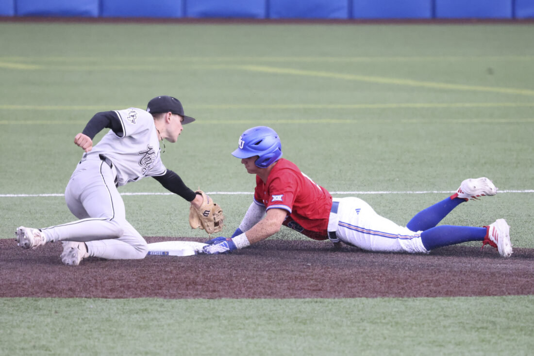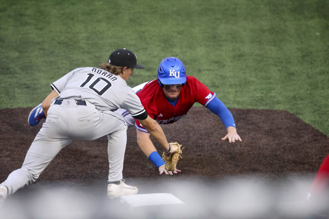 Kansas junior Brady Ballinger dives back into first base during game two of the Jayhawks’ doubleheader against UCF on Saturday, April 11, 2026, at Hoglund Ballpark in Lawrence.