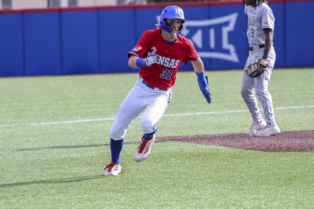 Kansas right fielder Jordan Bach rounds first base during game two of the Jayhawks’ doubleheader against UCF on Saturday, April 11, 2026, at Hoglund Ballpark in Lawrence.