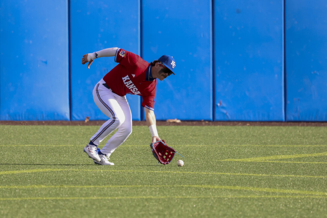 Kansas center fielder Tyson Owens fields a ground ball during game two of the Jayhawks’ doubleheader against UCF on Saturday, April 11, 2026, at Hoglund Ballpark in Lawrence.
