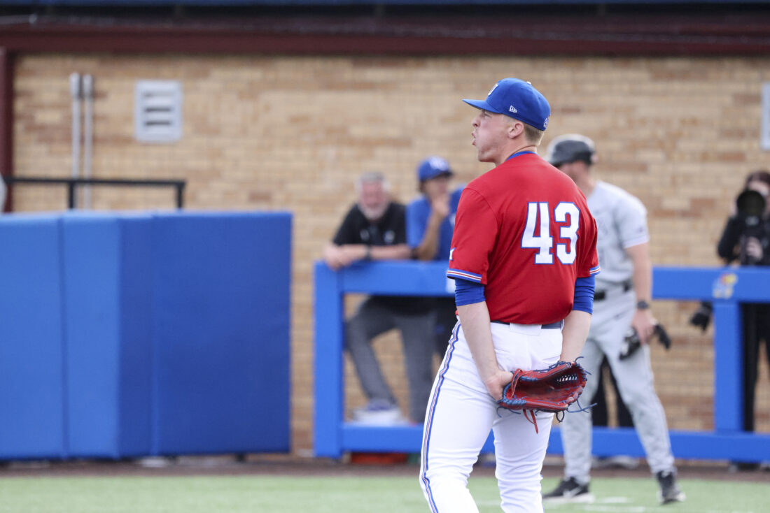 Kansas pitcher Mason Cook reacts to a call during game two of the Jayhawks’ doubleheader against UCF on Saturday, April 11, 2026, at Hoglund Ballpark in Lawrence.