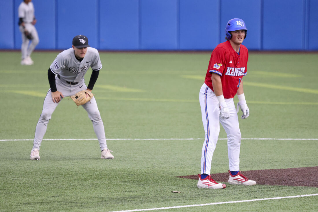 Kansas right fielder Jordan Bach takes his lead while being held on by UCF’s Landon Moran during game two of the Jayhawks’ doubleheader on Saturday, April 11, 2026, at Hoglund Ballpark in Lawrence.