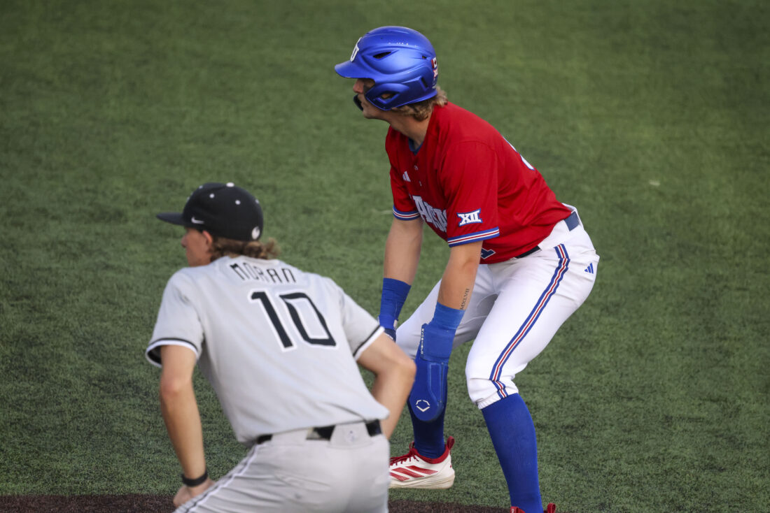Kansas senior Josh Dykhoff takes his lead off second during game two of the Jayhawks’ doubleheader against UCF on Saturday, April 11, 2026, at Hoglund Ballpark in Lawrence.