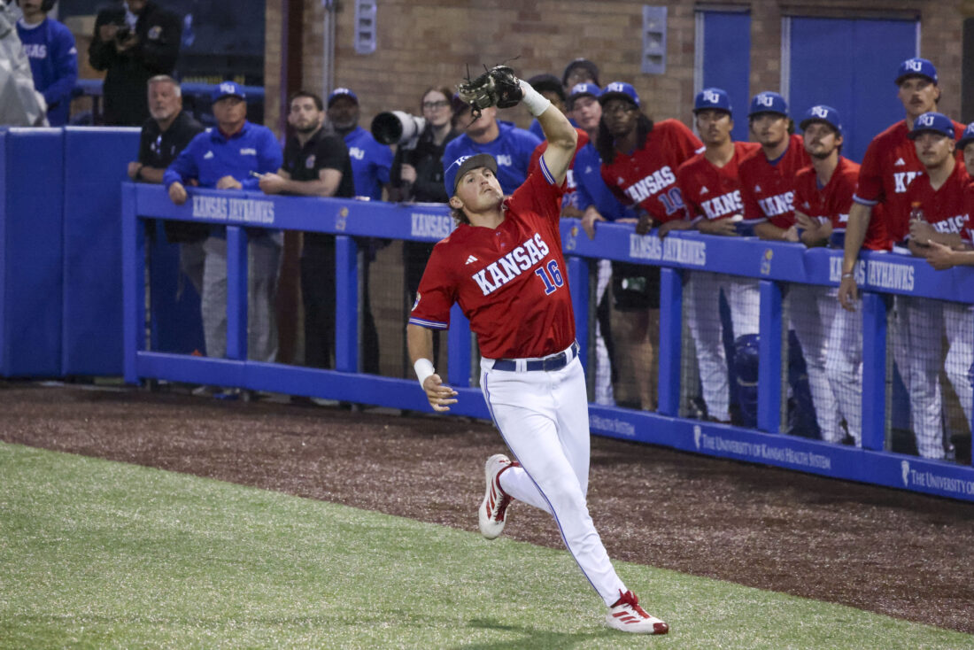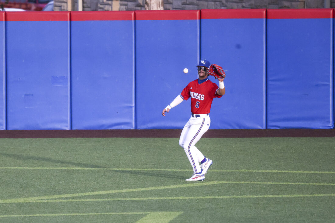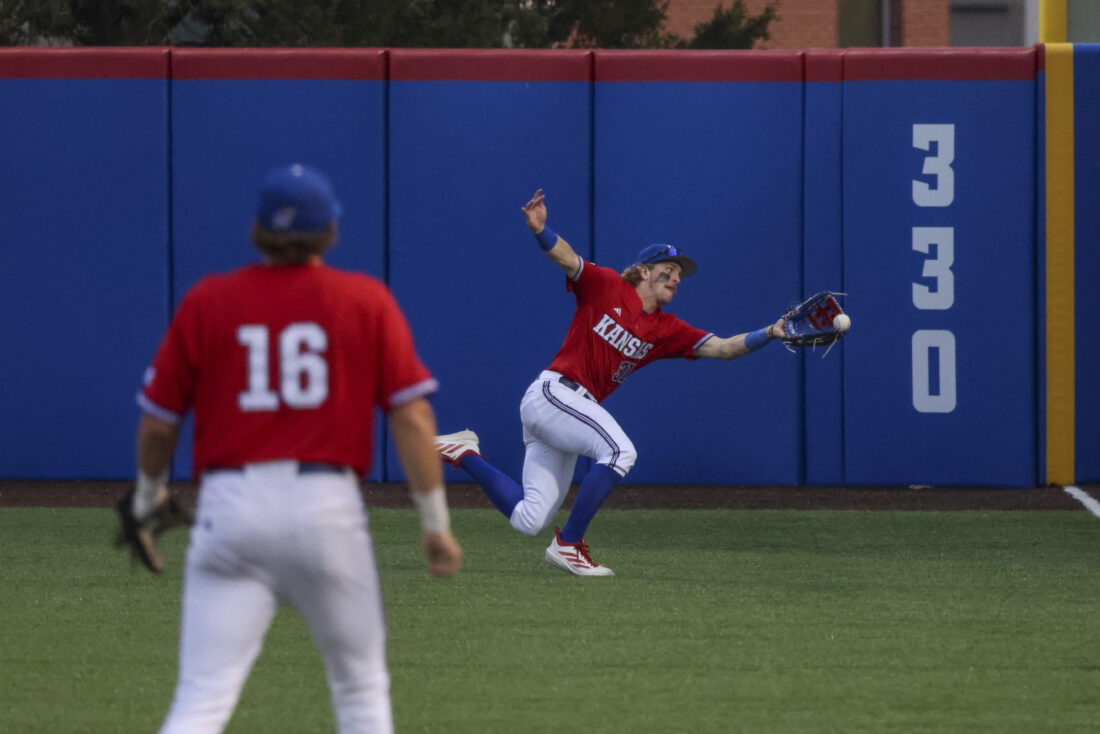 Kansas right fielder Jordan Bach makes a tough play during game two of the Jayhawks’ doubleheader against UCF on Saturday, April 11, 2026, at Hoglund Ballpark in Lawrence.