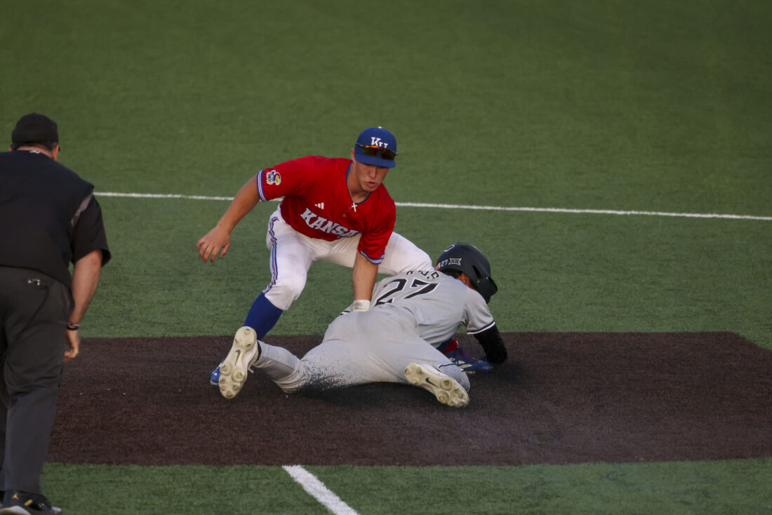 Kansas shortstop Tyson LeBlanc lays down a tag on UCF’s DeAmez Ross during game two of the Jayhawks’ doubleheader against UCF on Saturday, April 11, 2026, at Hoglund Ballpark in Lawrence.