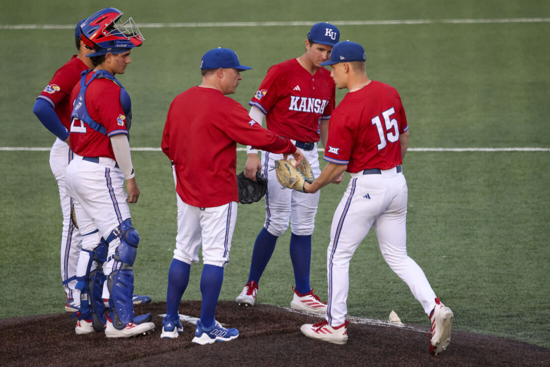 Kansas head coach Dan Fitzgerald hands the ball to pitcher Toby Scheidt (15) during game two of the Jayhawks’ doubleheader against UCF on Saturday, April 11, 2026, at Hoglund Ballpark in Lawrence.