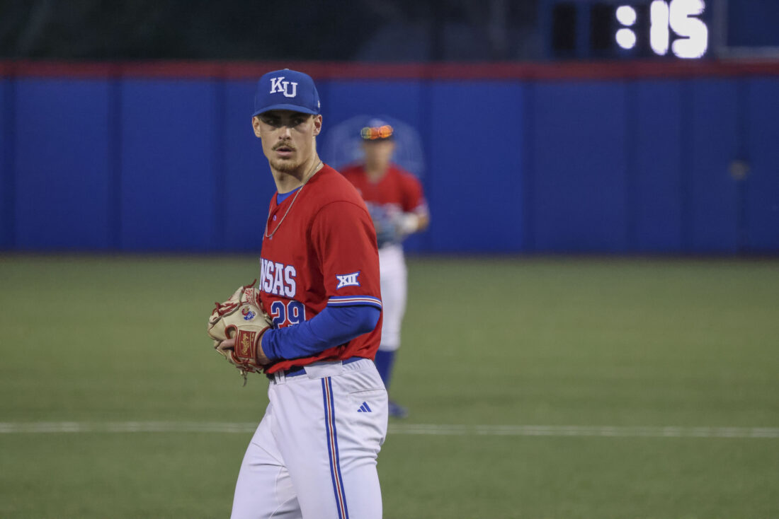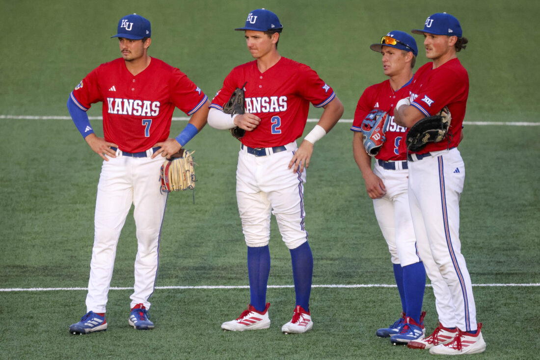 Kansas infielders Dylan Schlotterback, Tyson LeBlanc, Cade Baldridge, and Josh Dykhoff (left to right) watch their pitcher warm up during game two of the Jayhawks’ doubleheader against UCF on Saturday, April 11, 2026, at Hoglund Ballpark in Lawrence.